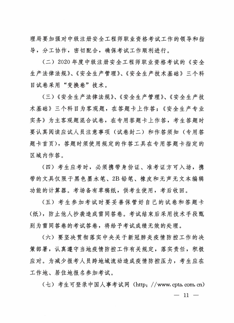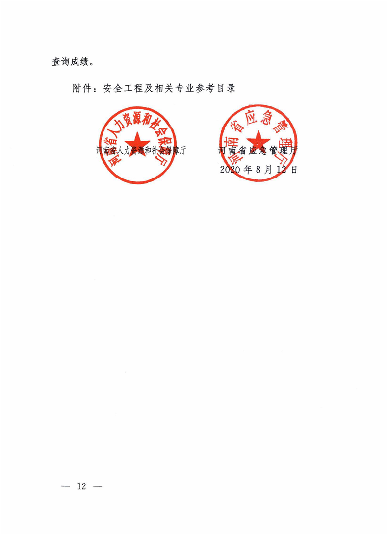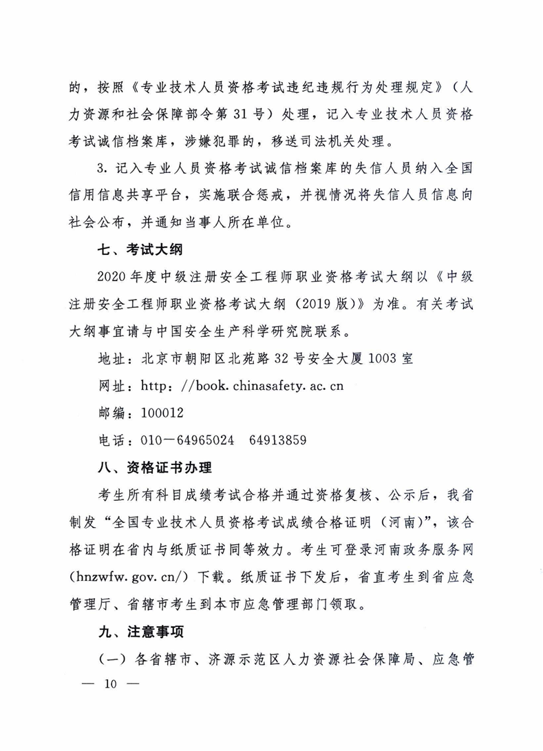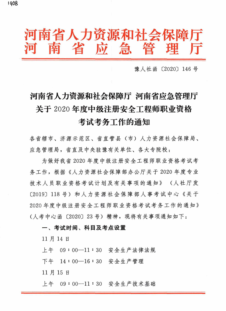 河南省人力資源和社會保障廳 河南省應急管理廳 關于2020年度中級注冊安全工程師職業資格 考試考務工作的通知