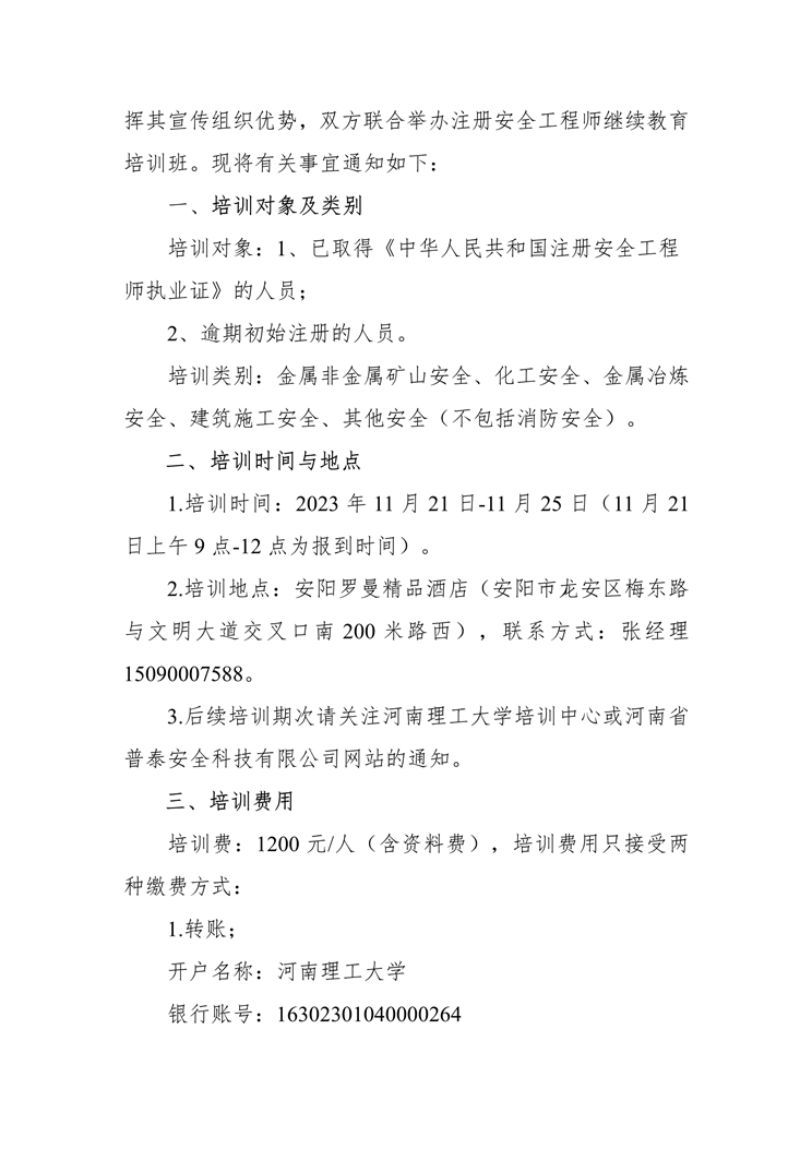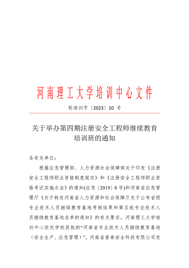關于舉辦第四期注冊安全工程師繼續教育培訓班的通知